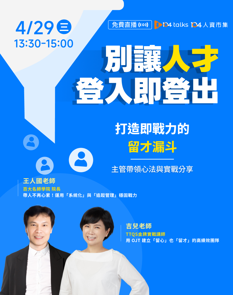 本次【104 talks】力邀兩位實戰派大師——吉兒老師與王人國老師,從 OJT 工作教導、離職心理分析到系統化晉升制度,為您拆解如何打造高績效團隊。